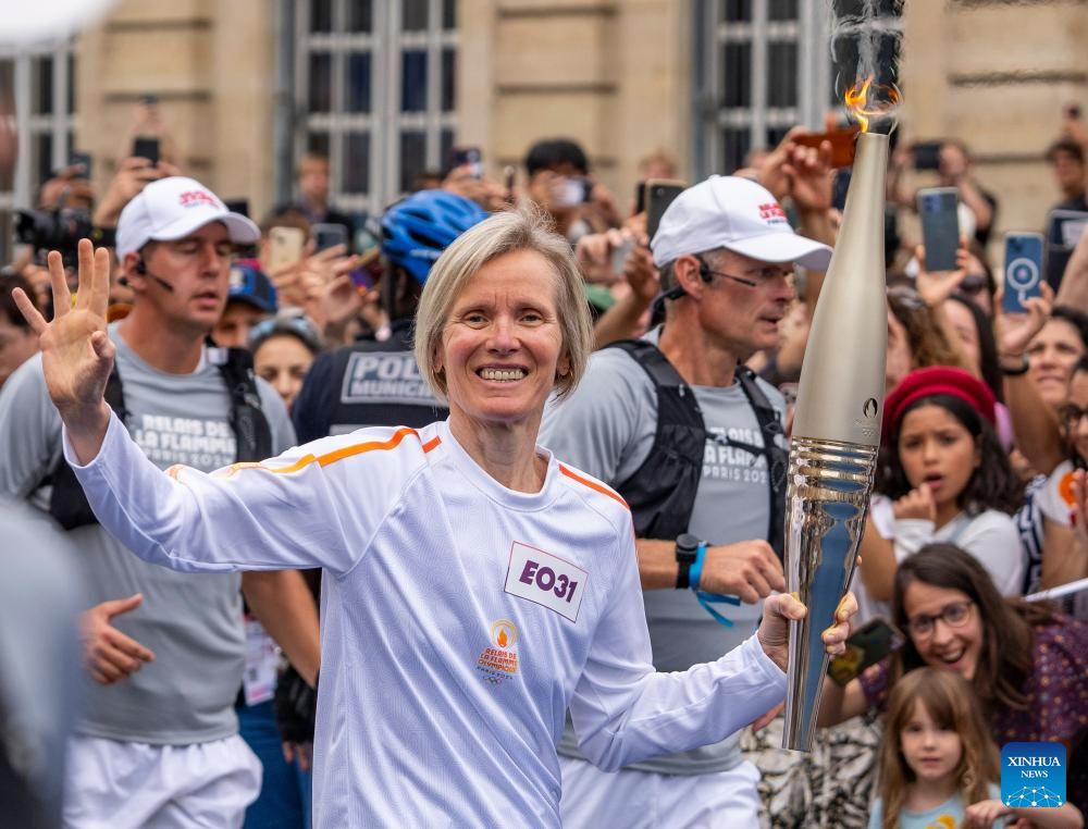 Torch bearer Claudine Laslaz holds the Olympic torch during the Olympic Games Paris 2024 Torch Relay in Paris, France, July 14, 2024. (Xinhua/Sun Fei)