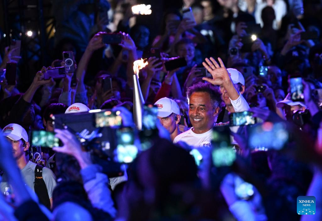 Torch bearer Yannick Noah (C) holds the Olympic torch during the Olympic Games Paris 2024 Torch Relay in Paris, France, July 14, 2024. (Xinhua/He Changshan)