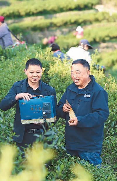 Members of a team advertise tea during a livestream at a tea garden in Shangfeng village, Jiaohu township, Wanzai county, east China's Jiangxi Province. (Photo/Deng Longhua)