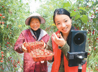 A young Party member promotes cherry tomatoes during a livestream at a family farm in Jinzha village, Binhai township, Wenling city, east China's Zhejiang Province. (Photo/Zheng Lingfu)