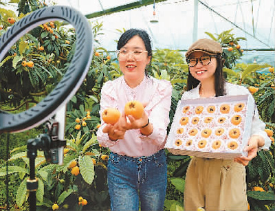 Town government officials advertise loquats in a loquat planting base during a livestream in Guiwan village, Wengong township, Renshou county, southwest China's Sichuan Province. (Photo/Pan Shuai)