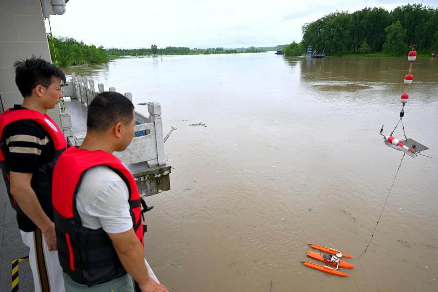Staff members monitor the flood water at a hydrological station in Funan County of Fuyang, east China's Anhui Province, July 14, 2024. (Xinhua/Huang Bohan)