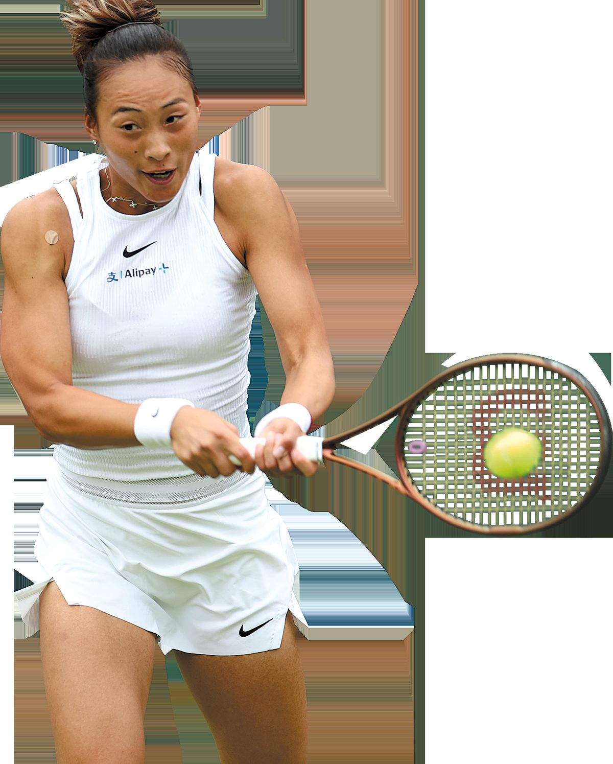 Zheng Qinwen in action during her first round match against New Zealand's Lulu Sun at the Wimbledon Championships, southwest London, on July 1. LI YING/XINHUA