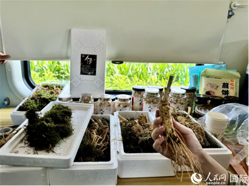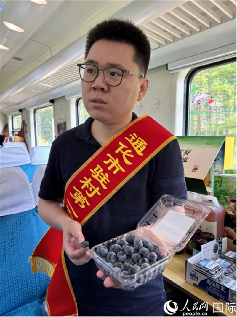 A man, who is the first secretary of a village in Tonghua city, promotes local specialty products on train 4347. (People's Daily Online/Xie Ying)