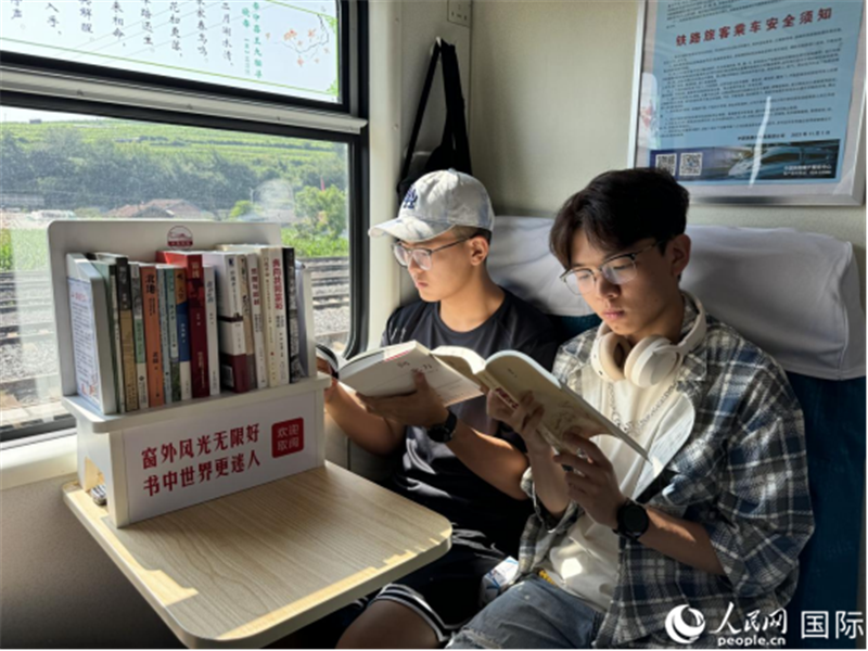 Two passengers read in the book corner on train 4347. (People's Daily Online/Xie Ying)