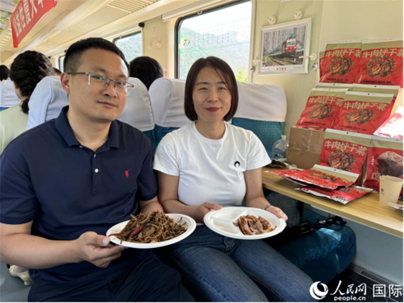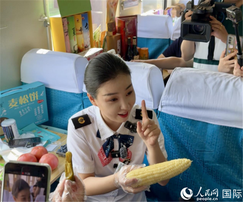 An influencer promotes local specialty products on train 4347. (People's Daily Online/Xie Ying)