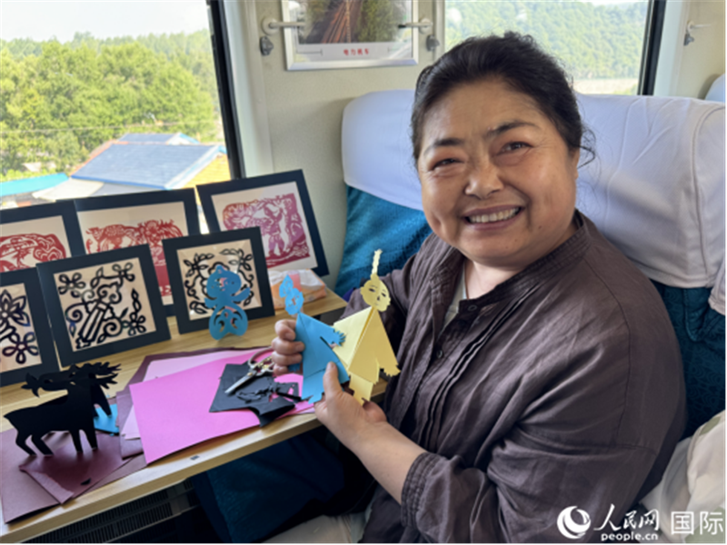An inheritor showcases paper cutting of the Manchu ethnic group on train 4347. (People's Daily Online/Xie Ying)