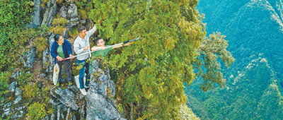 Members of a research team of the Xuebao Mountain national nature reserve in Kaizhou district, southwest China's Chongqing Municipality, collect seeds of Sichuan thuja on a cliff. (Photo courtesy of the interviewees)