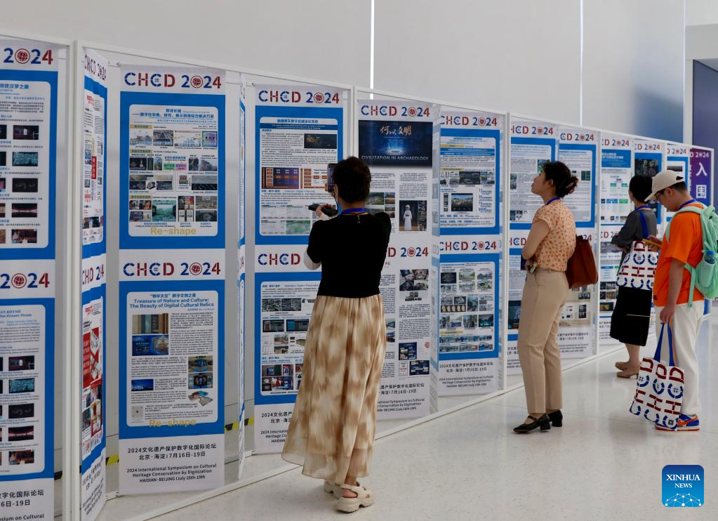 Guest to the seventh International Symposium on Cultural Heritage Conservation by Digitization look at posters in Beijing, capital of China, July 16, 2024. The seventh International Symposium on Cultural Heritage Conservation by Digitization (CHCD) kicked off Tuesday in Beijing. (Xinhua/Fang Sixian)