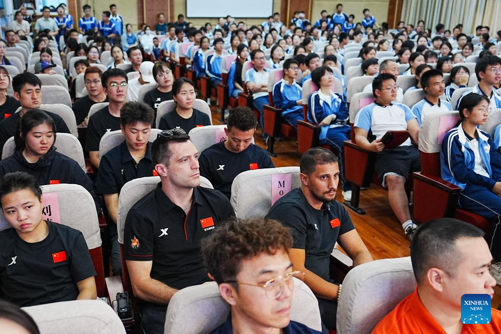 French coach Mounir Biba (C) with team members participates in an event to promote breaking at the Nanjing School for the Deaf in Nanjing, east China's Jiangsu Province, June 6, 2024. (Xinhua/Cao Can)