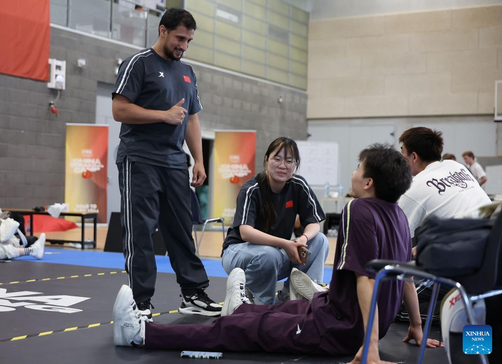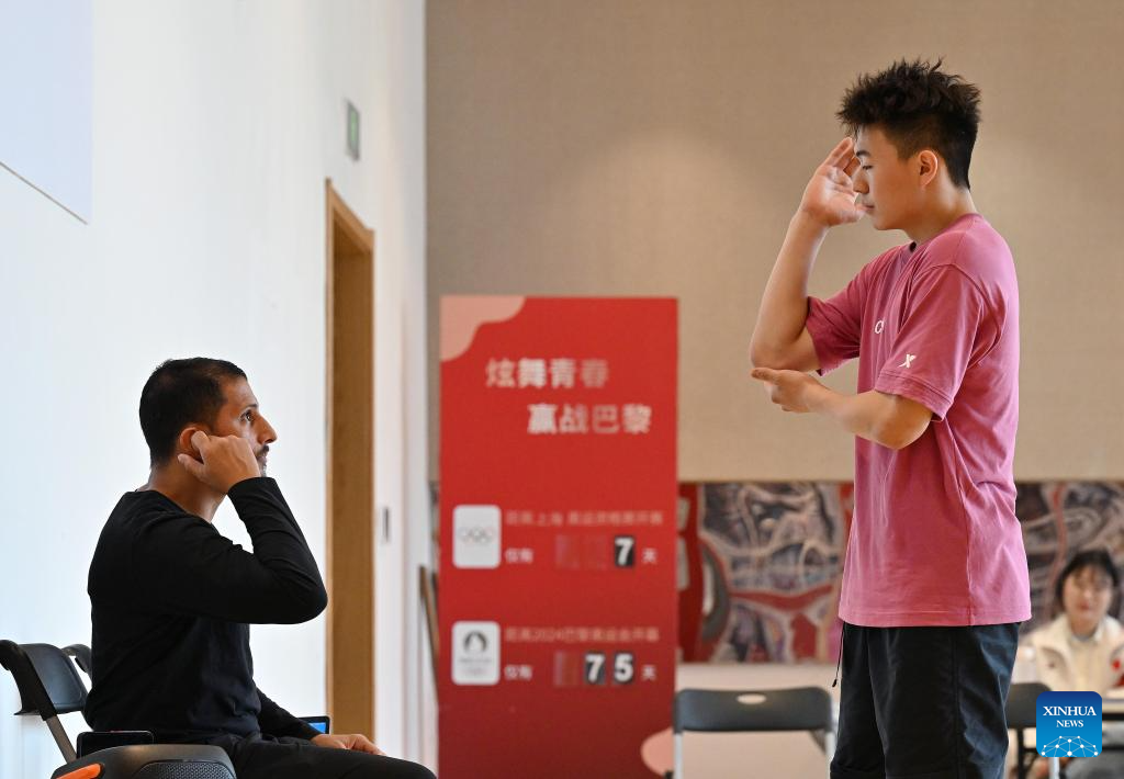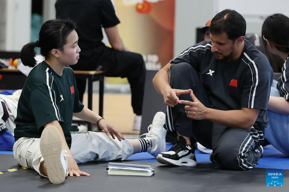 French coach Mounir Biba (R) communicates with Chinese breakdancer Liu Qingyi during training in Beauvais, France, July 11, 2024. (Xinhua/Cao Can)