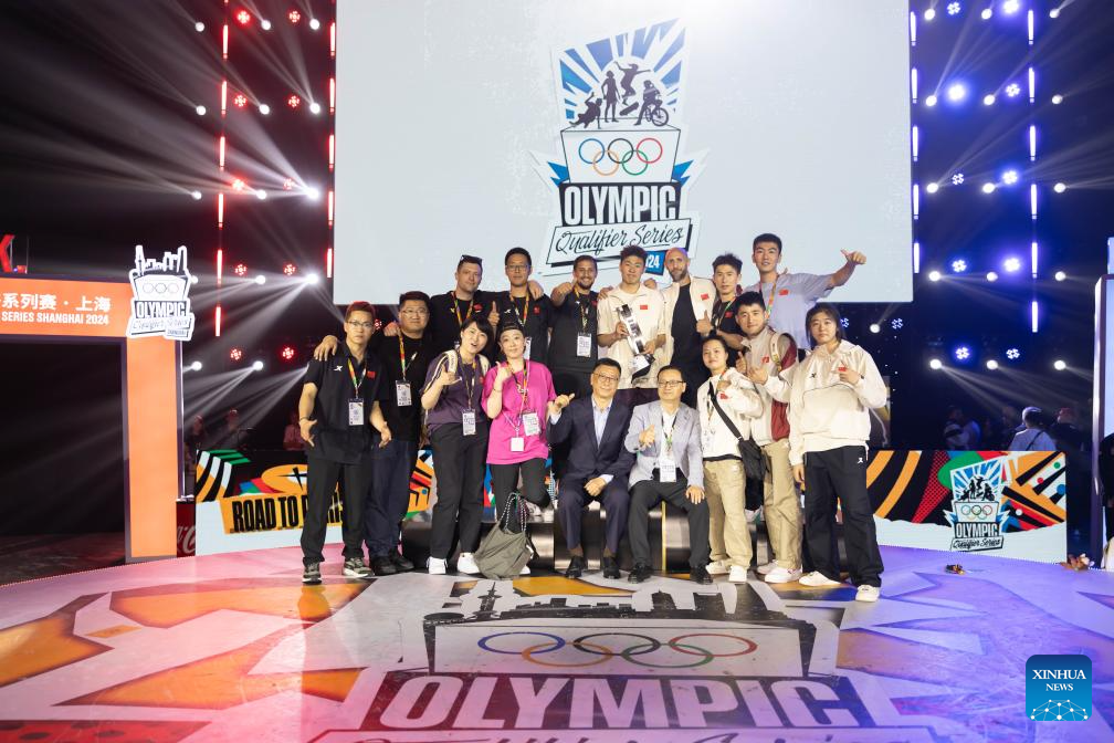 Members of Chinese breaking team pose for group photos after the Olympic Qualifier Series in east China's Shanghai, May 19, 2024.(Xinhua/Cao Can)