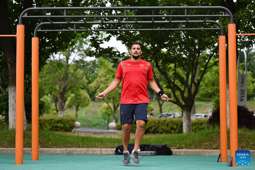 French coach Mounir Biba skips rope during his workout in Nanjing, east China's Jiangsu Province, May 10, 2024. (Xinhua/Cao Can)