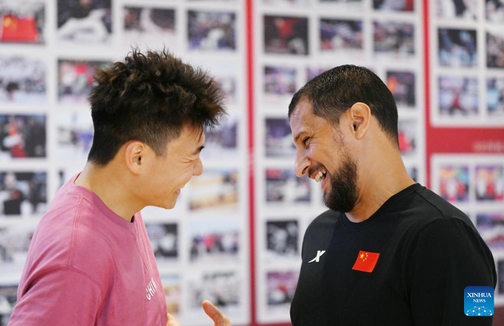 French coach Mounir Biba (R) chats with Chinese breakdancer Qi Xiangyu during a training session in Nanjing, east China's Jiangsu Province, May 11, 2024. (Xinhua/Cao Can)