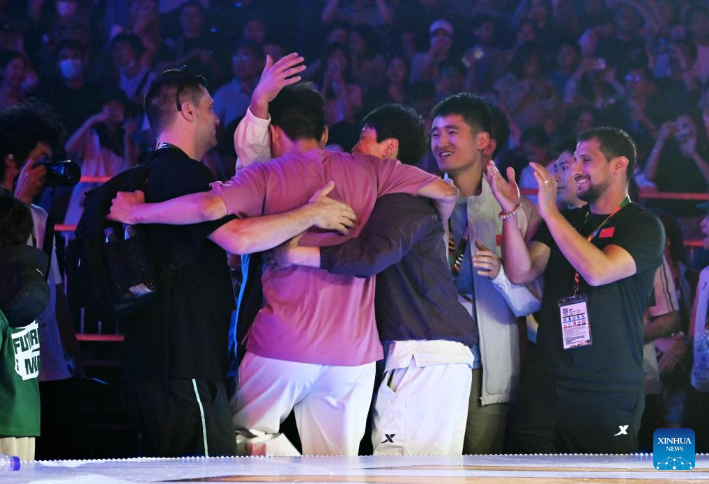 French coach Mounir Biba (1st R) celebrates for Chinese breakdancer Qi Xiangyu (2nd L) after the men's final at the Olympic Qualifier Series in east China's Shanghai, May 19, 2024. (Xinhua/Cao Can)