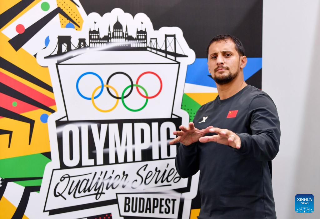 French coach Mounir Biba poses in front of the logo of Olympic Qualifier Series in Budapest, Hungary, June 23, 2024.(Xinhua/Cao Can)