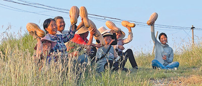 Zhang Guifang (1st from right) and villagers hold pumpkins in Sanjia village, Shilin township, Hebi city, central China's Henan Province. (Photo/Li Yang)