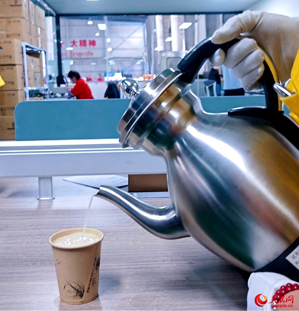 An employee pours butter tea from a high-altitude teapot into a cup at Xizang Shangchu Cooking Utensils Technology in Lhasa, capital of southwest China's Xizang Autonomous Region. (People's Daily Online/Li Haixia)