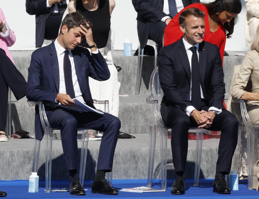 French President Emmanuel Macron (R) and Prime Minister Gabriel Attal attend the annual Bastille Day military parade in Paris, France, on July 14, 2024. (Photo by Henri Szwarc/Xinhua)