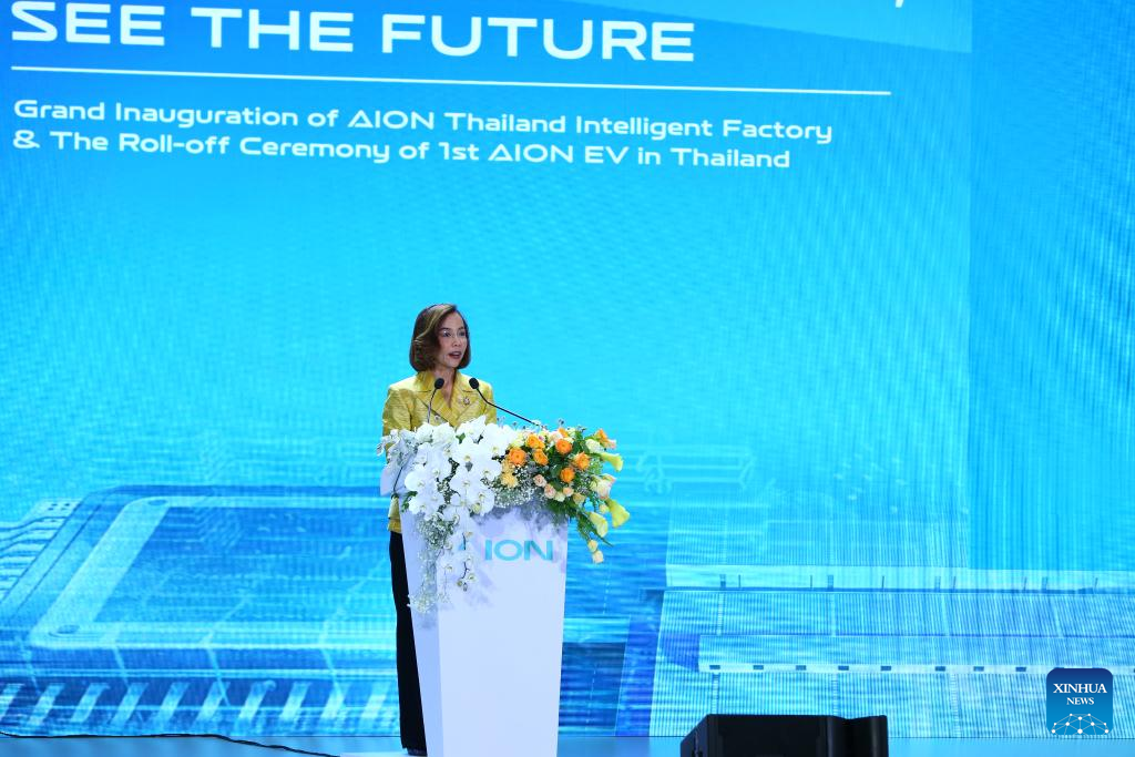 Thailand's Minister of Industry Pimphattra Wichaikul addresses the inauguration ceremony of the electric vehicle (EV) factory of China's carmaker GAC Aion in Rayong province, Thailand on July 17, 2024. (Xinhua/Sun Weitong)