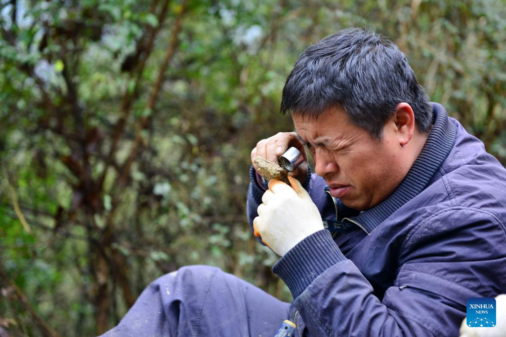 Liu Feng observes a paleontological fossil in a field scientific expedition in Qiandongnan Miao and Dong Autonomous Prefecture, southwest China's Guizhou Province, March 19, 2017. (Xinhua/Yang Wenbin)