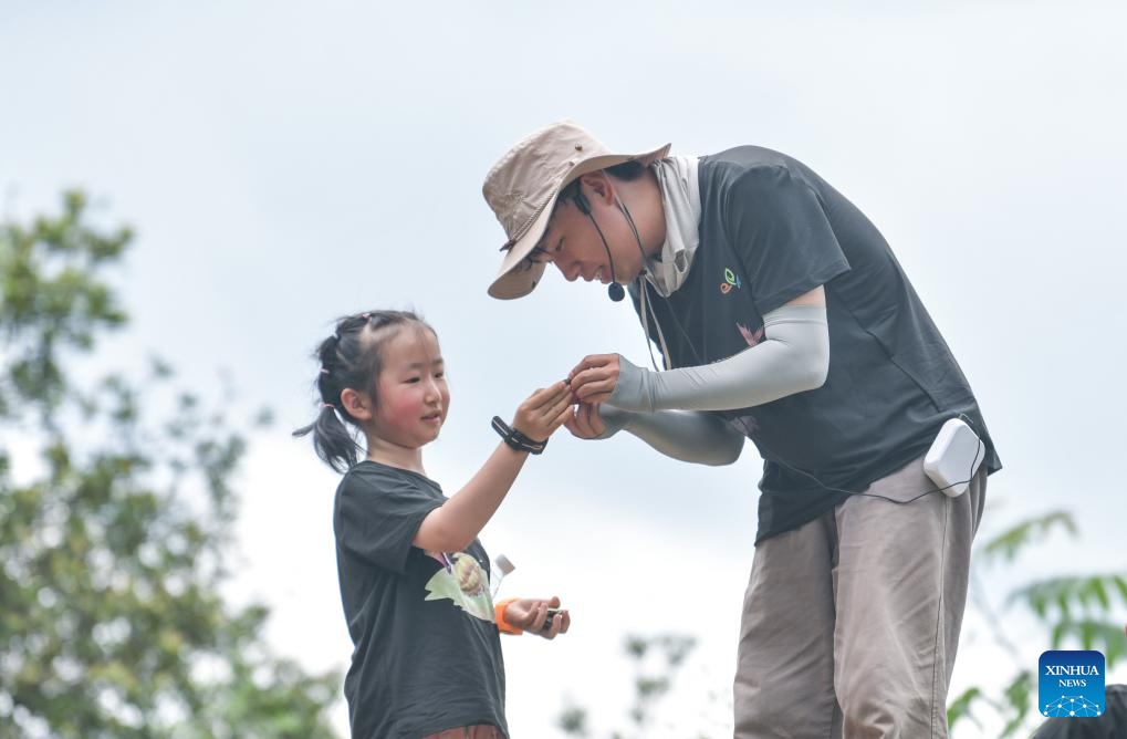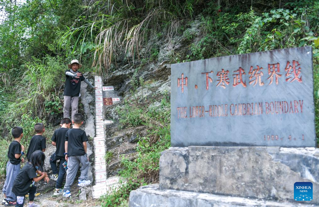 Liu Feng's son Liu Xingyu (1st R) explains geological knowledge to children during the summer vacation at the Miaoling National Geopark in Qiandongnan Miao and Dong Autonomous Prefecture, southwest China's Guizhou Province, July 15, 2024. (Xinhua/Yang Wenbin)