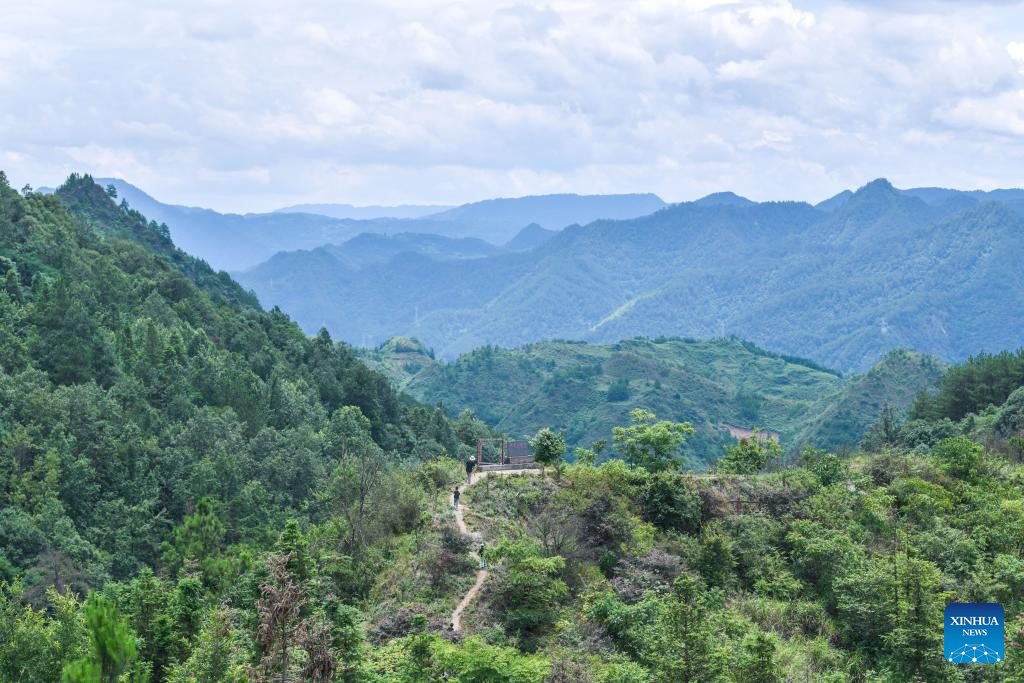 In this aerial drone photo, Liu Xingyu leads the children to walk in Miaoling National Geopark in Qiandongnan Miao and Dong Autonomous Prefecture, southwest China's Guizhou Province, July 15, 2024. (Xinhua/Yang Wenbin)