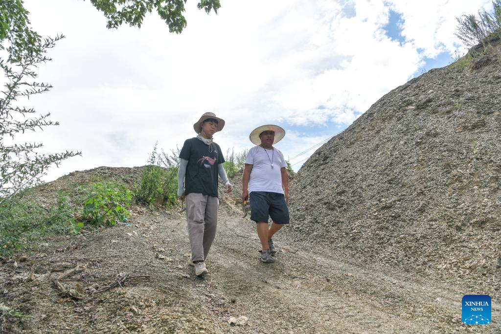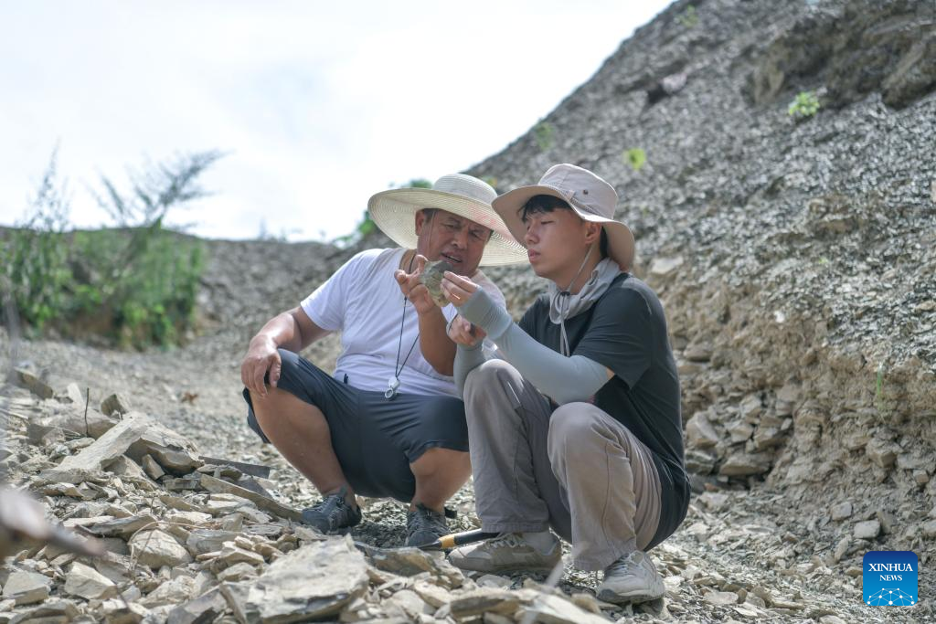 Liu Feng (L) and his son Liu Xingyu collect paleontological fossils in Qiandongnan Miao and Dong Autonomous Prefecture, southwest China's Guizhou Province, July 15, 2024. (Xinhua/Yang Wenbin)