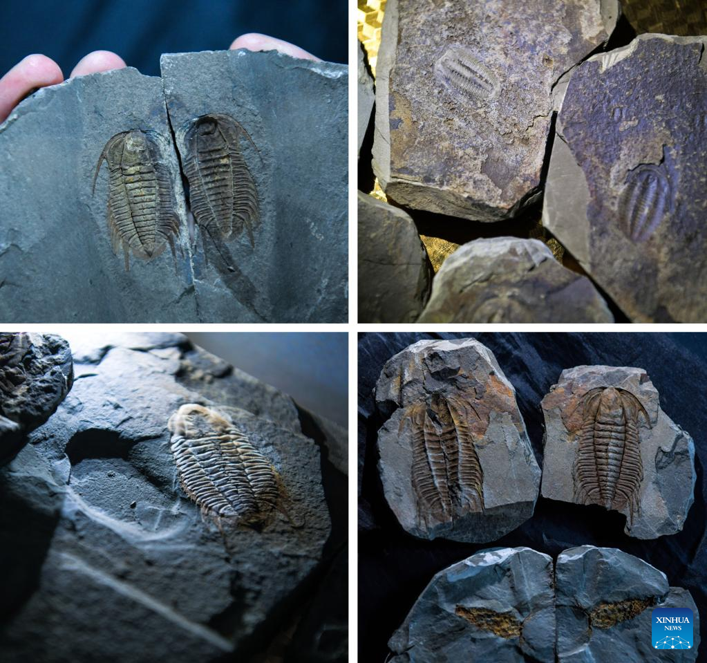 This combo photo taken on July 15, 2024 shows paleontological fossils at Balang Paleontological Fossils Exhibition Hall in Jianhe County of Qiandongnan Miao and Dong Autonomous Prefecture, southwest China's Guizhou Province. (Xinhua/Yang Wenbin)