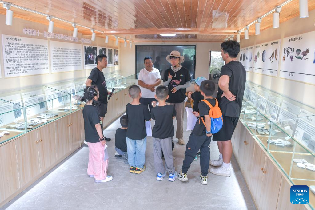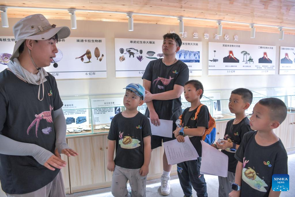 Liu Feng's son Liu Xingyu (L) introduces the formation process of paleontological fossils to children at Balang Paleontological Fossils Exhibition Hall in Jianhe County of Qiandongnan Miao and Dong Autonomous Prefecture, southwest China's Guizhou Province, July 15, 2024. (Xinhua/Yang Wenbin)