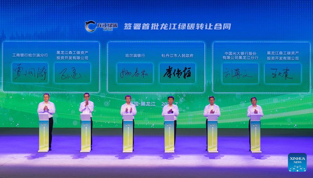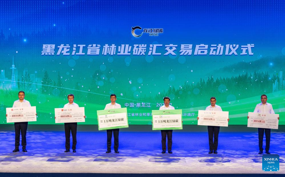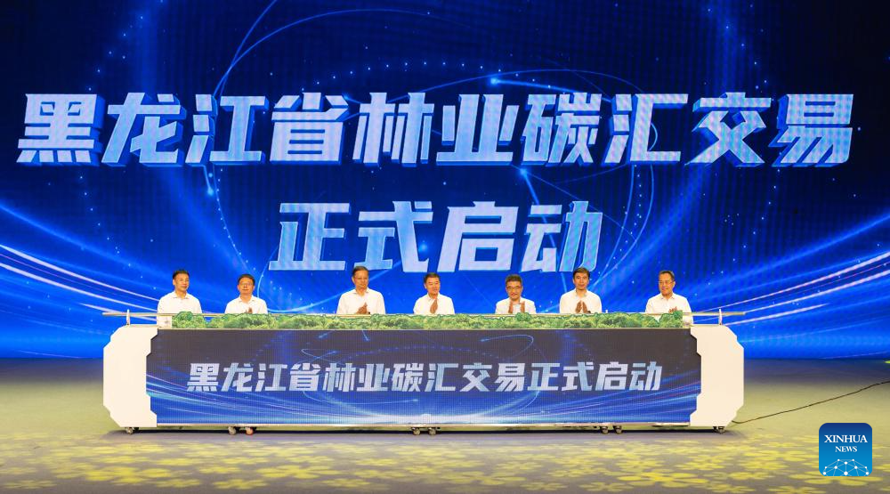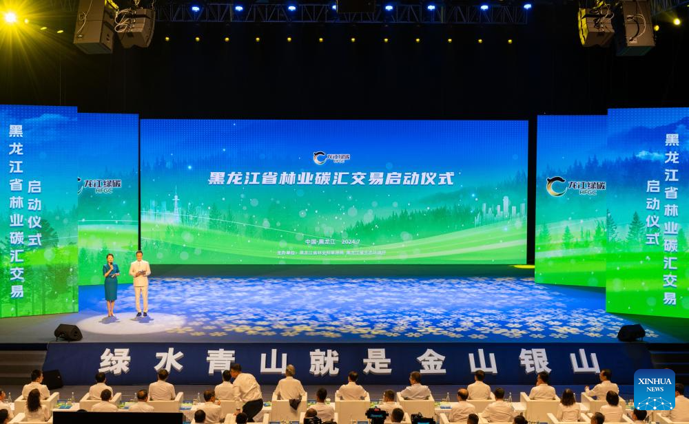 This photo taken on July 17, 2024 shows a launching ceremony of forestry carbon-sink trading of Heilongjiang Province in Harbin, northeast China's Heilongjiang Province. A launching ceremony of a forestry carbon-sink trading system of Heilongjiang Province was held here on Wednesday. Data from the Heilongjiang Forestry and Grassland Administration shows that the carbon storage of forestry in Heilongjiang, a major forestry province in China, is about 5.7 billion tonnes. (Xinhua/Xie Jianfei)