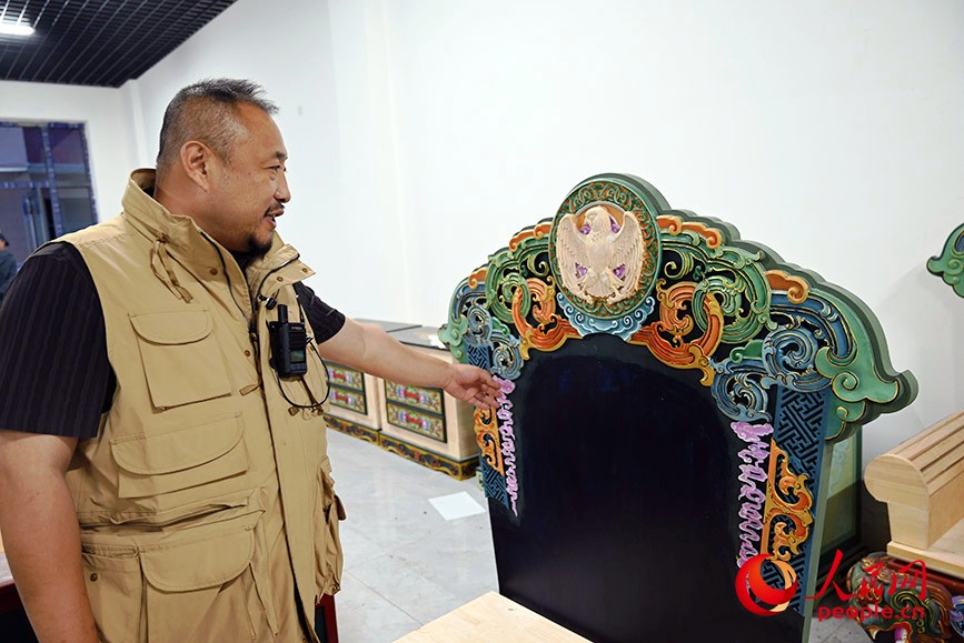 Wen Dousu showcases a piece of Mongolian furniture. (People's Daily Online/Liu Yilin)