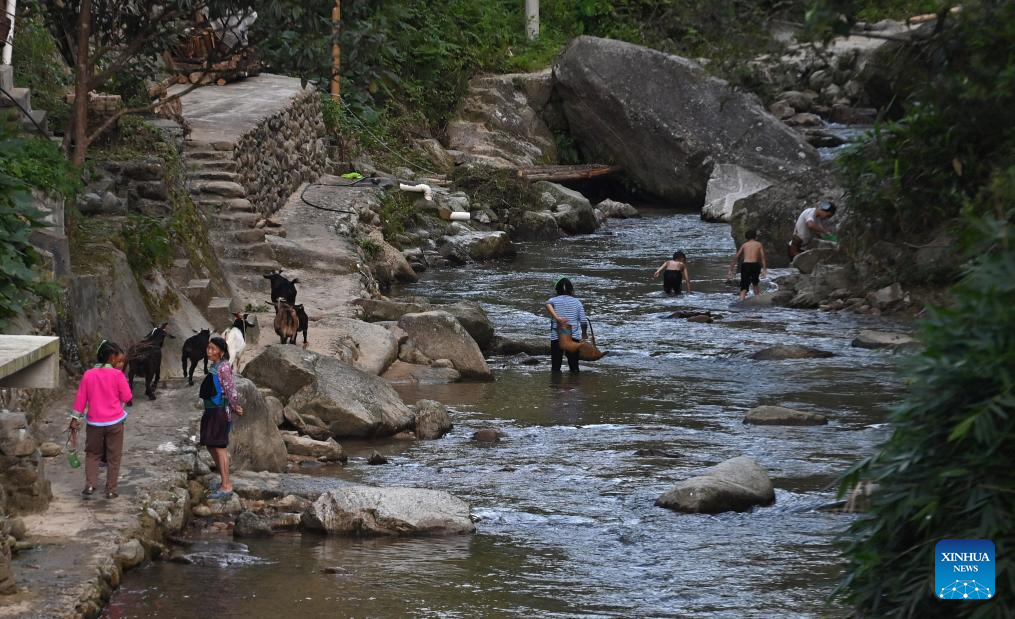 Villagers engage in conversations after herding sheep in Wuying Village on the border between south China's Guangxi Zhuang Autonomous Region and southwest China's Guizhou Province, July 12, 2024. (Xinhua/Huang Xiaobang)
