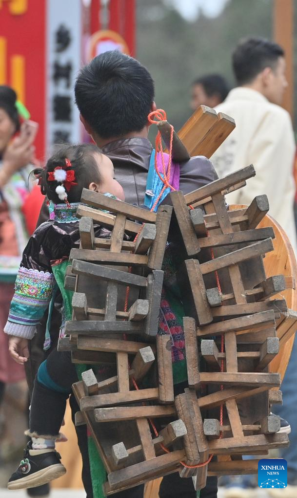 A villager with wooden benches and a child on his back walks to an open-air banquet in Wuying Village on the border between south China's Guangxi Zhuang Autonomous Region and southwest China's Guizhou Province, Feb. 14, 2024. (Xinhua/Huang Xiaobang)