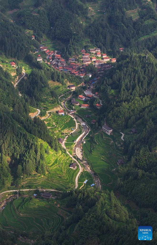 This aerial drone photo taken on July 10, 2024 shows a view of the Wuying Village on the border between south China's Guangxi Zhuang Autonomous Region and southwest China's Guizhou Province. (Xinhua/Huang Xiaobang)