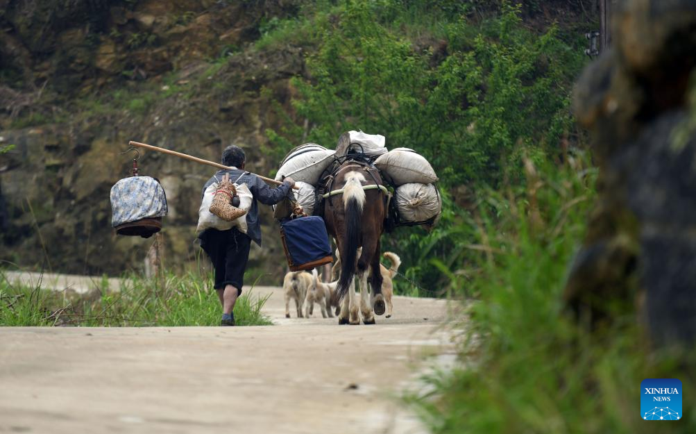 Villager Pan Zhongqing goes to work in Wuying Village on the border between south China's Guangxi Zhuang Autonomous Region and southwest China's Guizhou Province, April 12, 2024. (Xinhua/Huang Xiaobang)