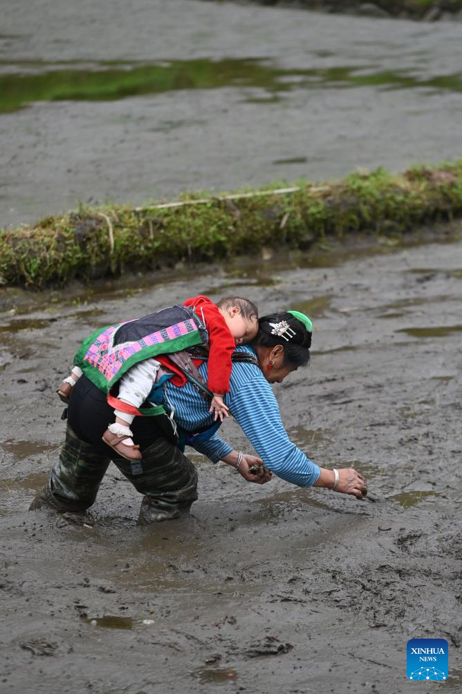 A villager works in a field in Wuying Village on the border between south China's Guangxi Zhuang Autonomous Region and southwest China's Guizhou Province, April 12, 2024. (Xinhua/Huang Xiaobang)