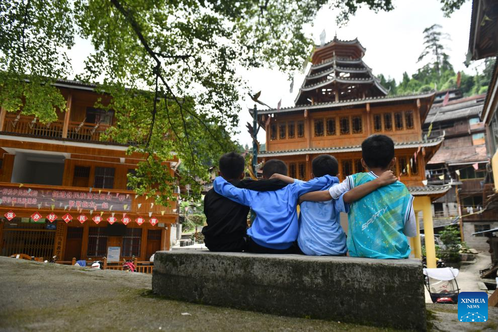 Children play under an ancient tree in Wuying Village on the border between south China's Guangxi Zhuang Autonomous Region and southwest China's Guizhou Province, July 18, 2024. (Xinhua/Huang Xiaobang)