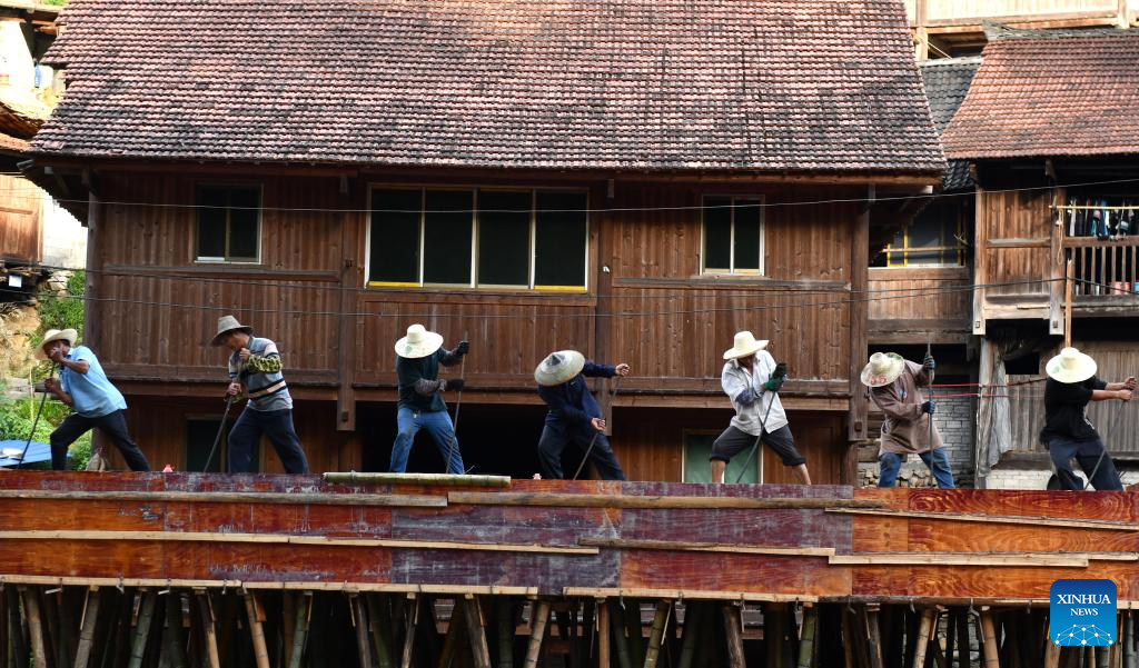Villagers construct a wood building in Wuying Village on the border between south China's Guangxi Zhuang Autonomous Region and southwest China's Guizhou Province, July 21, 2022. (Xinhua/Huang Xiaobang)