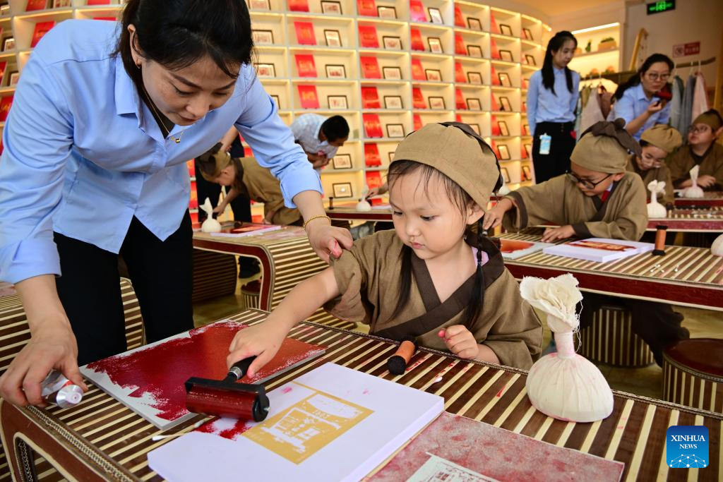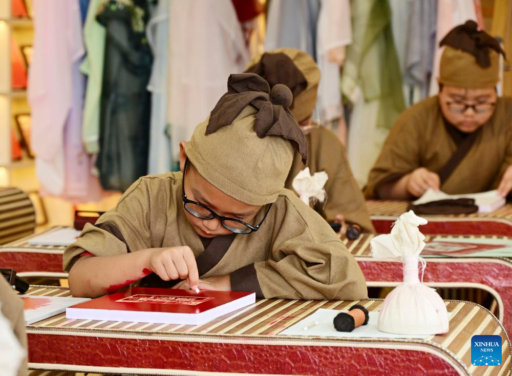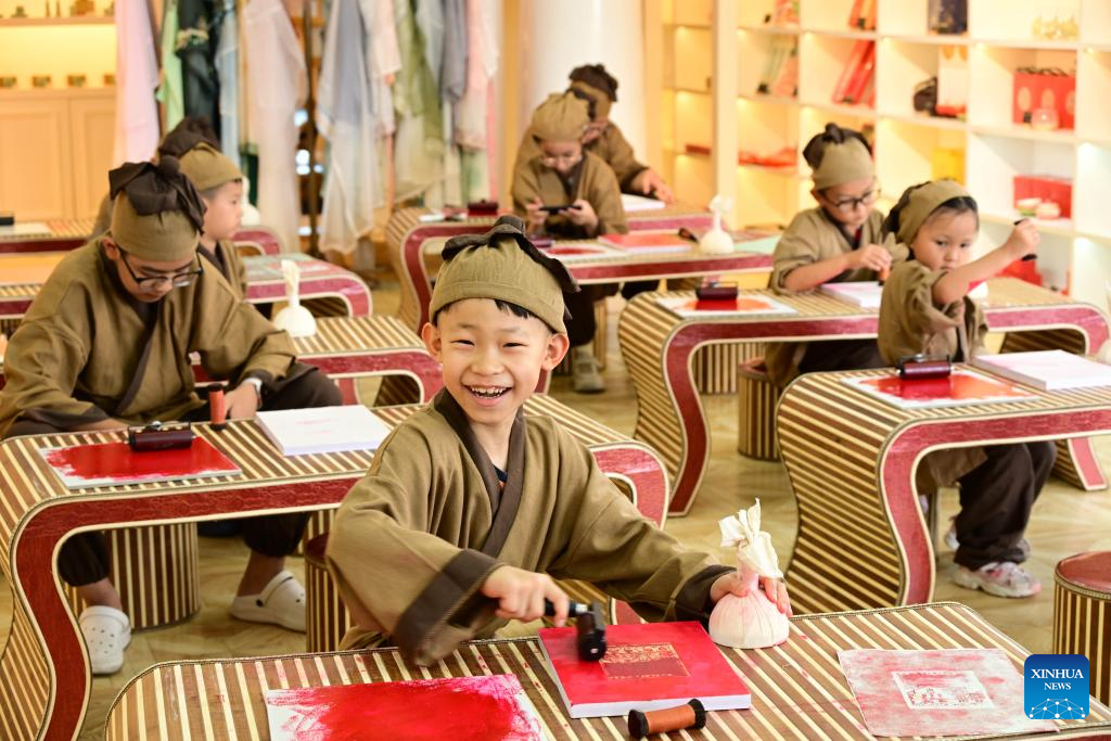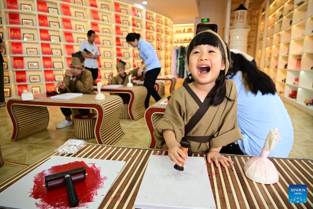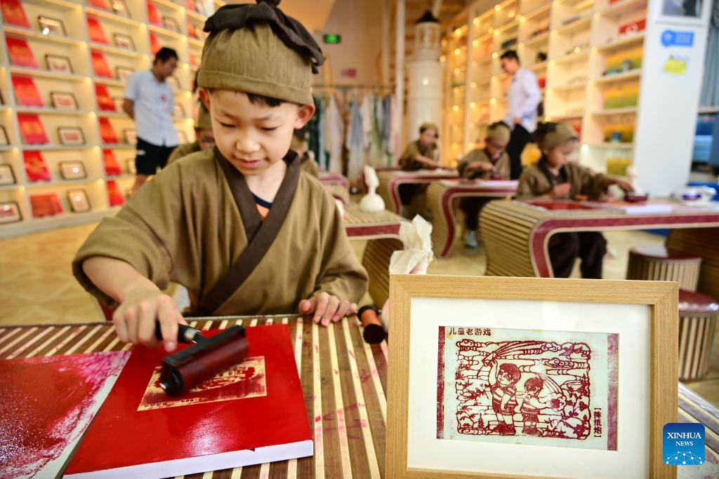 Children try rubbing at an art space themed on Chinese culture in Qingdao, east China's Shandong Province, July 19, 2024. The art space held experience activities on traditional rubbing techniques for children during the summer vacation. (Xinhua/Li Ziheng)