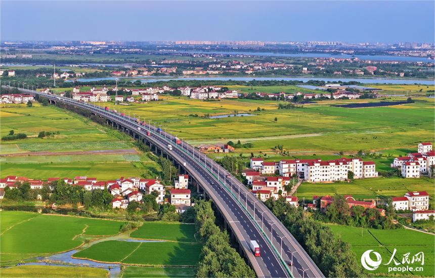 An expressway passing near Xijiang village of Nanxin township, in Nanchang county, Nanchang city, the capital of east China's Jiangxi Province, forms a harmonious view combining a modern landscape with rural scenery. White-walled and red-tiled farmhouses line the route, contrasting delightfully with the rice paddies as they transition from green to golden hues.