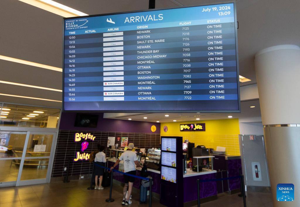 A screen with unmodified flight information is seen at Billy Bishop Toronto City Airport in Toronto, Canada, on July 19, 2024. A faulty software update from cybersecurity firm CrowdStrike Friday morning has affected computers-running Microsoft Windows at organizations, causing major IT outage, taking out banks, airlines and businesses globally. (Photo by Zou Zheng/Xinhua)