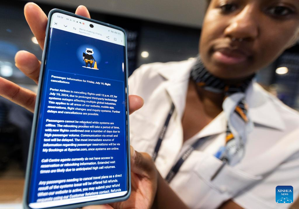 A staff member of Porter Airlines displays an online notification about the airline's cancellation at Billy Bishop Toronto City Airport in Toronto, Canada, on July 19, 2024. A faulty software update from cybersecurity firm CrowdStrike Friday morning has affected computers-running Microsoft Windows at organizations, causing major IT outage, taking out banks, airlines and businesses globally. (Photo by Zou Zheng/Xinhua)