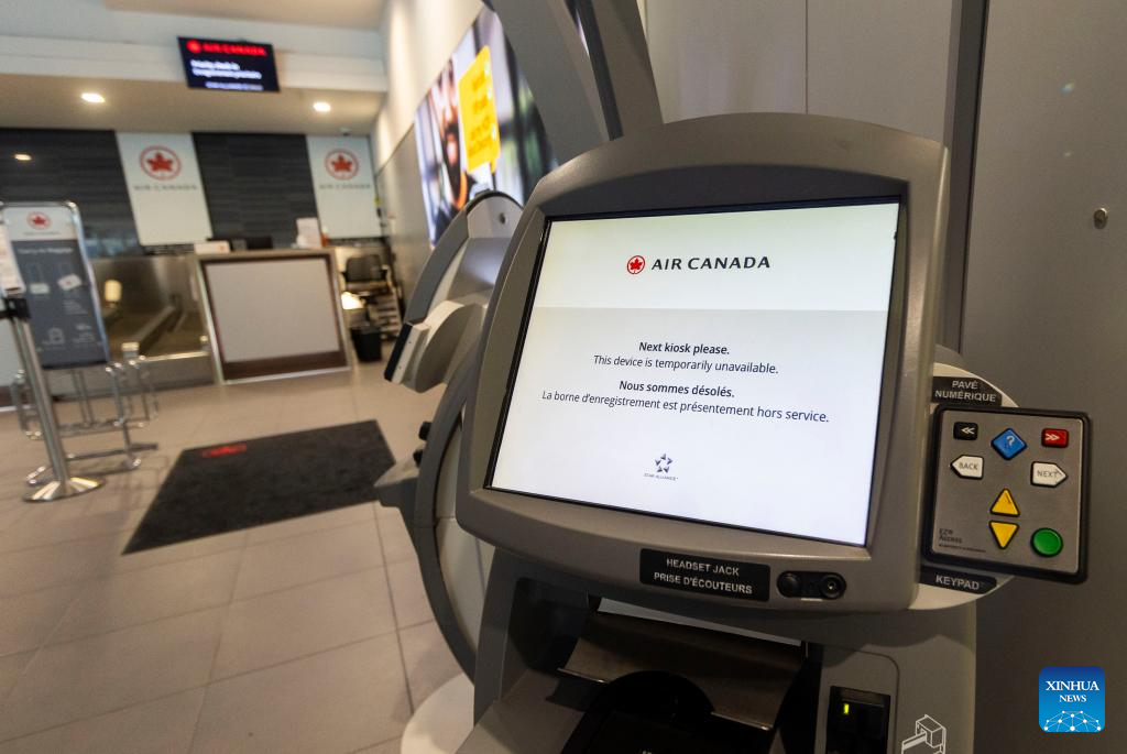 A suspended self-check-in kiosk is seen at Billy Bishop Toronto City Airport in Toronto, Canada, on July 19, 2024. A faulty software update from cybersecurity firm CrowdStrike Friday morning has affected computers-running Microsoft Windows at organizations, causing major IT outage, taking out banks, airlines and businesses globally. (Photo by Zou Zheng/Xinhua)