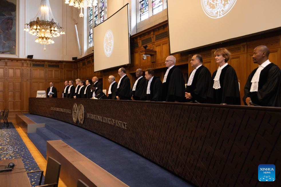 Judges attend a public session of the International Court of Justice (ICJ) at the Peace Palace in The Hague, the Netherlands, on July 19, 2024. The International Court of Justice (ICJ) on Friday called on Israel to end its "unlawful" presence in the occupied Palestinian territories as rapidly as possible. (Photo by Sylvia Lederer/Xinhua)