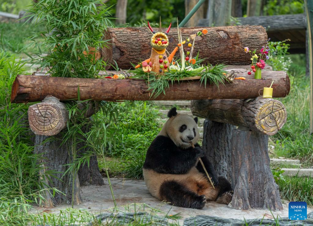 Giant panda Pan Yue enjoys a birthday treat at the Shenshuping giant panda base of Wolong National Nature Reserve in southwest China's Sichuan Province, July 19, 2024. A special event was held to celebrate the birthdays of giant pandas here on Friday. Carrots, watermelons and other food were prepared for them as the birthday treat. (Xinhua/Yu Li)