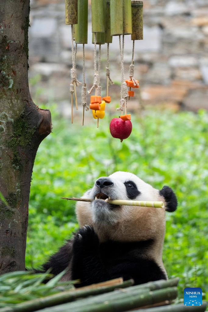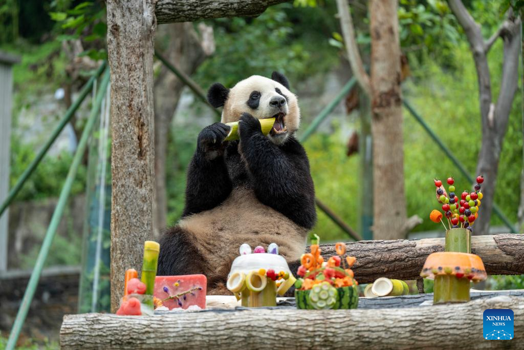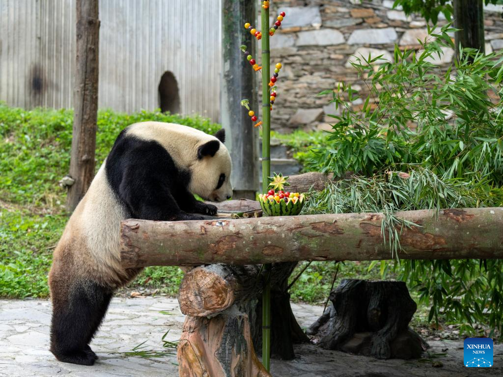 Giant panda Bai Ji enjoys a birthday treat at the Shenshuping giant panda base of Wolong National Nature Reserve in southwest China's Sichuan Province, July 19, 2024. A special event was held to celebrate the birthdays of giant pandas here on Friday. Carrots, watermelons and other food were prepared for them as the birthday treat. (Xinhua/Xue Chen)