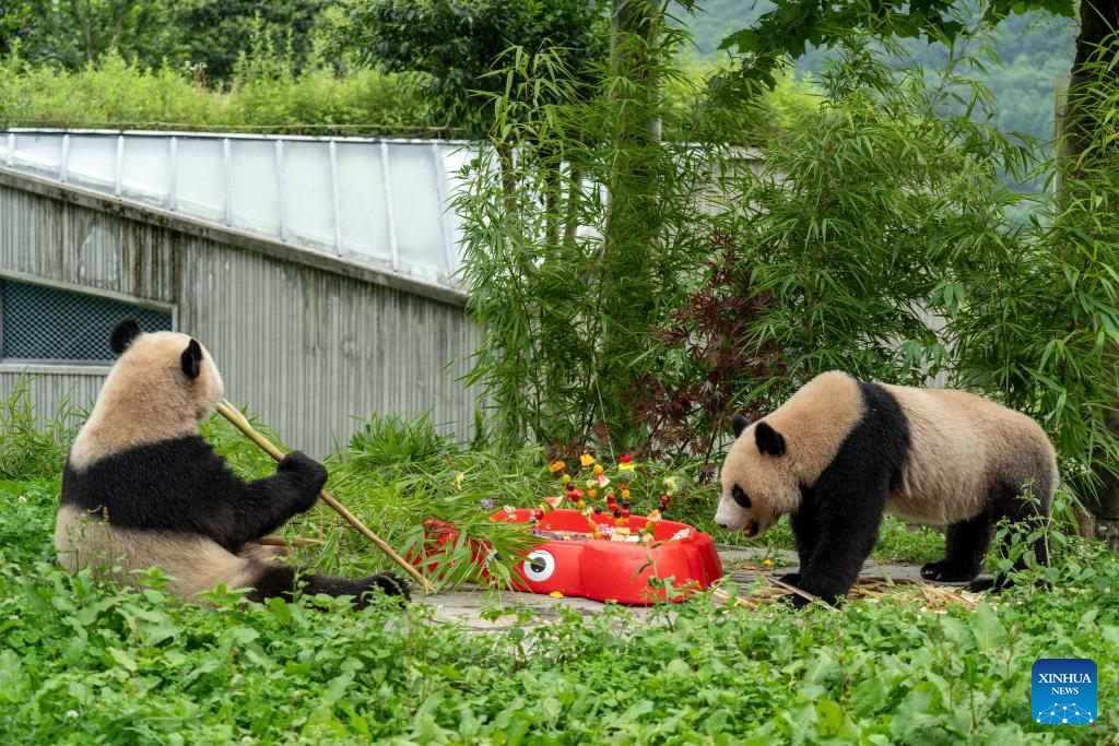 Giant panda Bai Ji (L) and Sheng Lan enjoy a birthday treat at the Shenshuping giant panda base of Wolong National Nature Reserve in southwest China's Sichuan Province, July 19, 2024. A special event was held to celebrate the birthdays of giant pandas here on Friday. Carrots, watermelons and other food were prepared for them as the birthday treat. (Xinhua/Xue Chen)