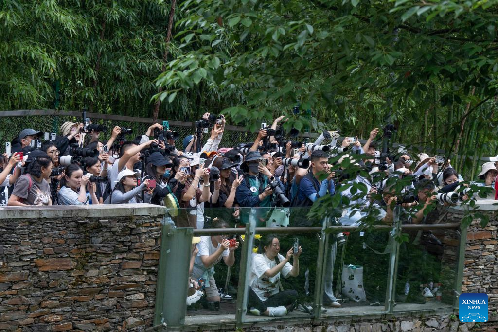 Visitors take photos of the giant pandas during a birthday event at the Shenshuping giant panda base of Wolong National Nature Reserve in southwest China's Sichuan Province, July 19, 2024. A special event was held to celebrate the birthdays of giant pandas here on Friday. Carrots, watermelons and other food were prepared for them as the birthday treat. (Xinhua/Xue Chen)