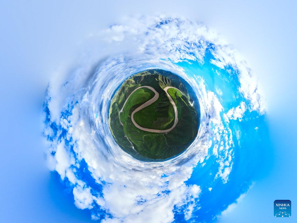 An aerial panoramic photo taken with a drone on July 19, 2024 shows the scenery at a bend along the Yellow River in Mentang Township of Jiuzhi County, Golog Tibetan Autonomous Prefecture, northwest China's Qinghai Province. (Xinhua/Zhang Long)